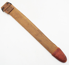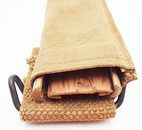 WWI era M1905 Bayonet Scabbard. Khaki cotton body with leather tip. Body has some wear from usage, but overall intact and in good condition. The wooden insert is crushed. Don't know if you could get a blade to fit inside. Good display piece.