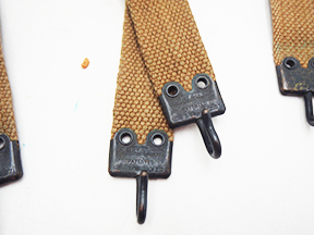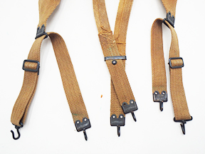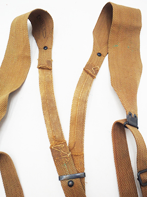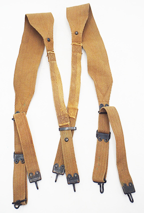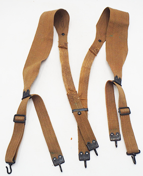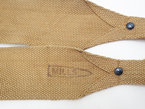 WWI US Army M1907 Suspenders. Khaki cotton/canvas body is in good condition with some wear from usage. Metal hardware is in good condition. Back straps have been modified to make them longer. Modification is strong and in good condition. Suspenders are still useable. Marked MILLS but cannot see a date.