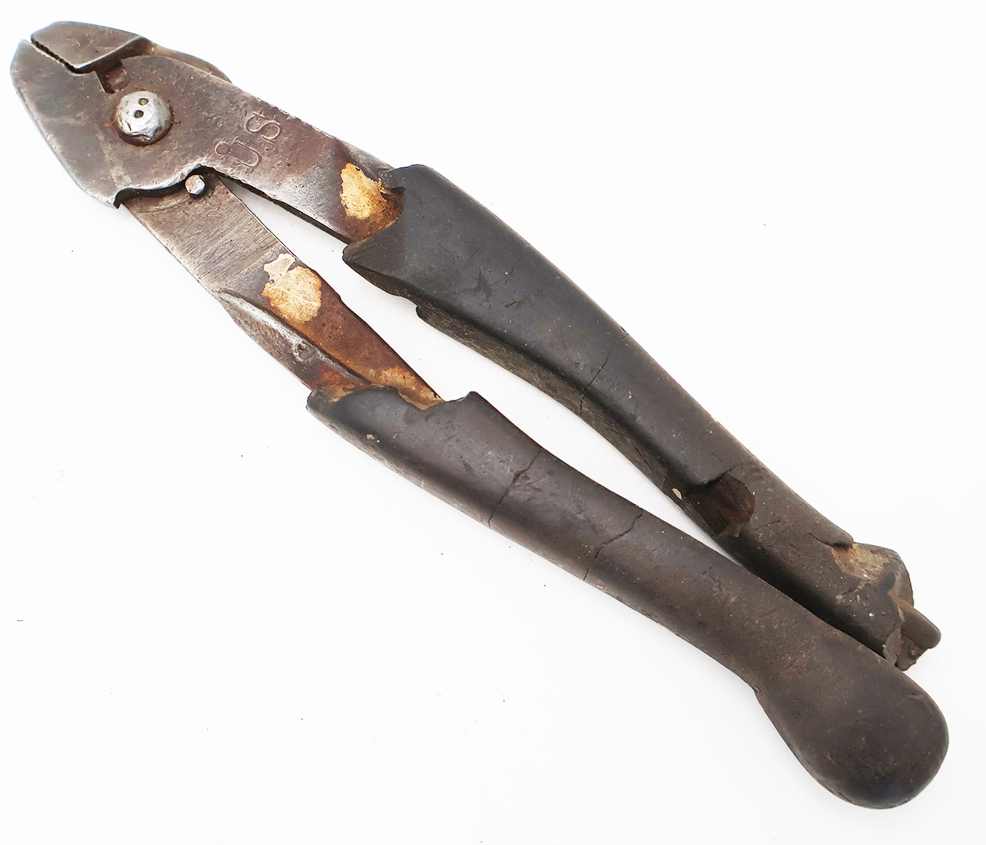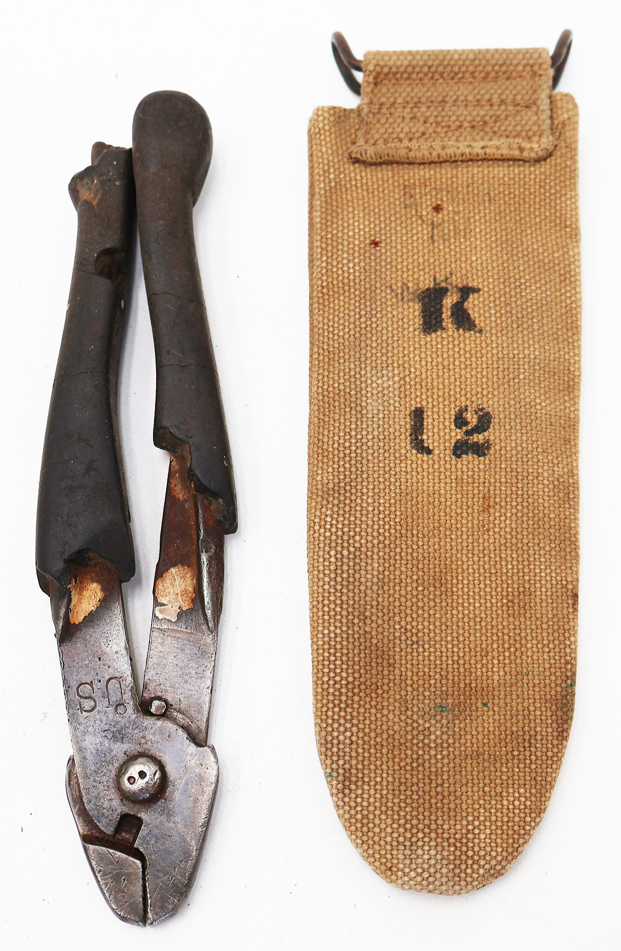 WWI US Army Wire Cutters, Unit Marked. Both the cutters and pouch are notably worn. Parts of the rubber grips are dried and broken off. Cutter still work well. Pouch is stained and has wear. The pouch can still hold weight. Unit markings are on the back side of the pouch. Pouch makers mark are faded, but the date 1917 can be made out.