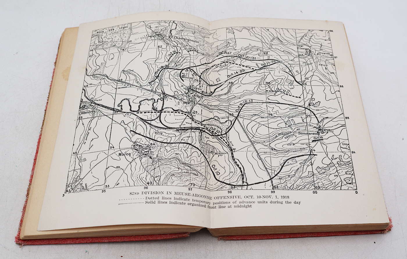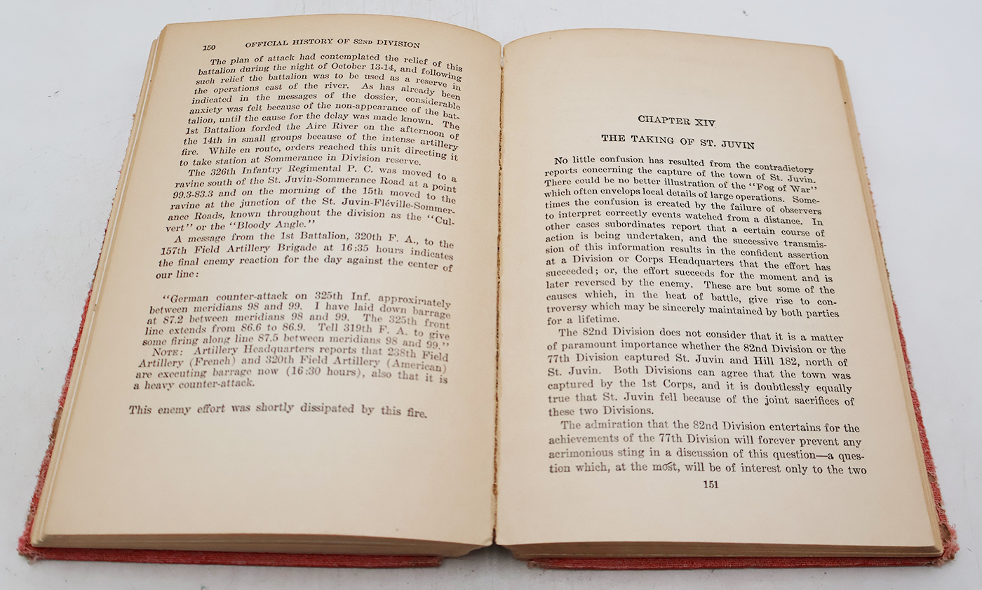 WWI era The 82nd Infantry Division Unit History. The book cover and pages have wear and are yellowed from age. The outer part of the spine is missing, but the binding is still strong. Some Photos and illustrations. No torn or missing pages. The book is 1919 dated. The book contains approx. 310 pages.