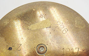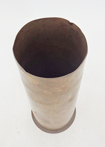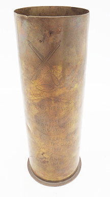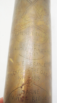 WWI 2nd Northhamptonshire Regiment Trench Art Shell. About 9 inches tall. Brass shell casing with cross rifles, helmet and name of the member of the regiment on it. Names the battle of Marne and Vimy Ridge. Shell appears to be 1917 dated.
