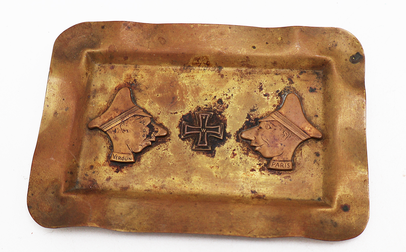 WWI Trench Art Anti-German French Ashtray. Brass astray is hammered out from an artillery shell. Has the images of an iron cross and two German officers. Has PARIS and VERDUN written below the officers. Overall, the ash tray is in good condition. Measures 4 x 3 inches.
