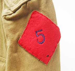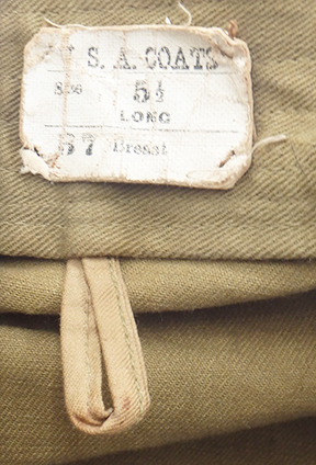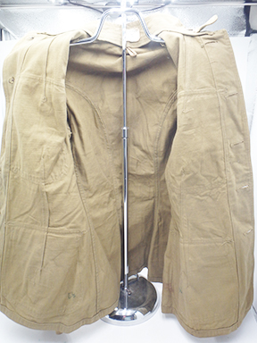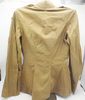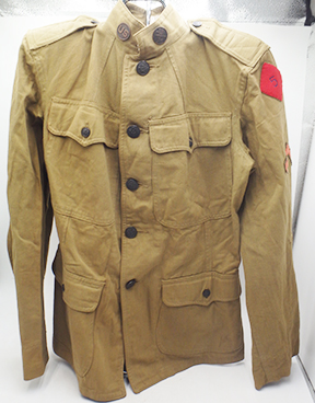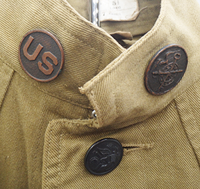 WWI era 5th Infantry Division Khaki Twill Jacket. Standard issue WWI summer weight jacket. On the left sleeve is a wool 5th Division patch. Patch has some minor moth damage. On both sleeves are musician specialty rates. On the collar as enlisted US and quartermaster devices. Small size labelled a chest size 37. Wrinkled, but otherwise in good condition.