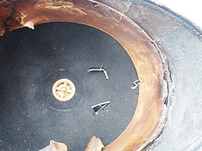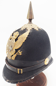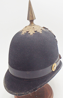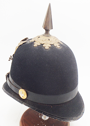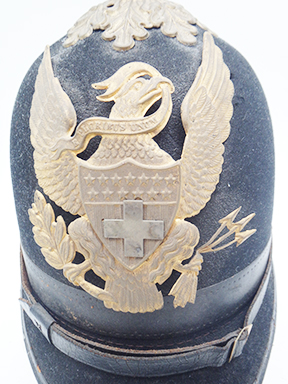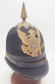Indian Wars 1880’s Medical Corps Pith Helmet. Body is in solid shape with just some wear and dryness to the leather. Spike on top is firmly affixed with not notable damage. Medical insignia is in good shape. Small size. Inside is worn from age.